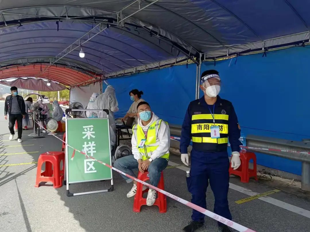 壽寧縣南陽鎮青年義務消防隊員配合醫護人員開展核酸采樣工作。郭曉紅 供圖
