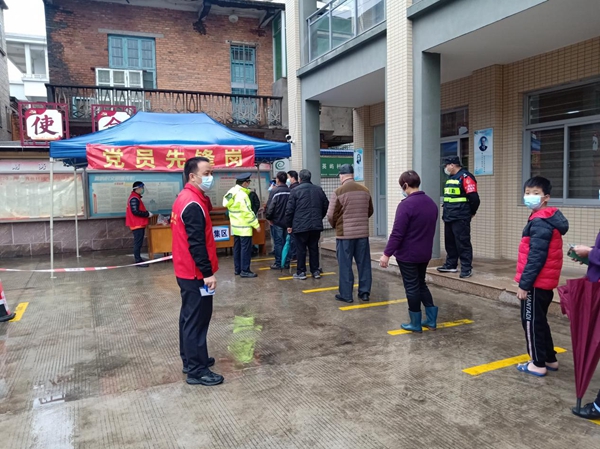 黨員志愿者在結對村協(xié)助核酸檢測現(xiàn)場秩序維護