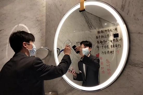 作為入住酒店之一,泉州濱江皇冠假日酒店在房間布置上藏了些心思。為了感謝防疫人員,在每間房間的鏡子上,酒店工作人員都寫上了暖心祝福,還畫上了一個個“大白”。