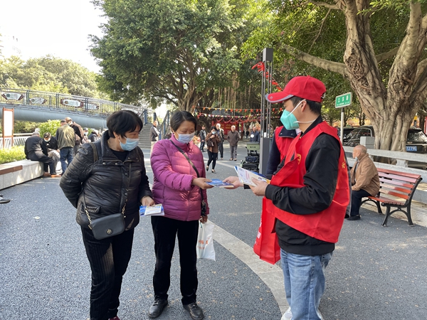 黨員志愿者向過往居民發(fā)放疫情防控宣傳手冊(長樂區(qū)衛(wèi)健局供圖)
