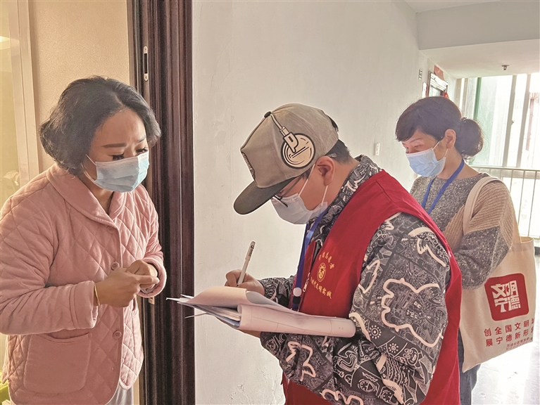 3月26日以來,市委文明辦每天組織干部職工下沉萬達社區(qū)開展疫情防控志愿服務活動。黨員志愿者們身著“紅馬甲”穿梭小區(qū)各樓道間,逐戶開展信息排查,向群眾宣傳、講解防疫措施。李瑩 攝