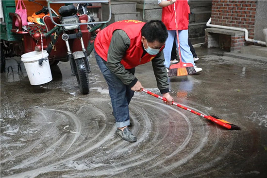 社區工作人員與居民一起清洗地板。臨江街道供圖