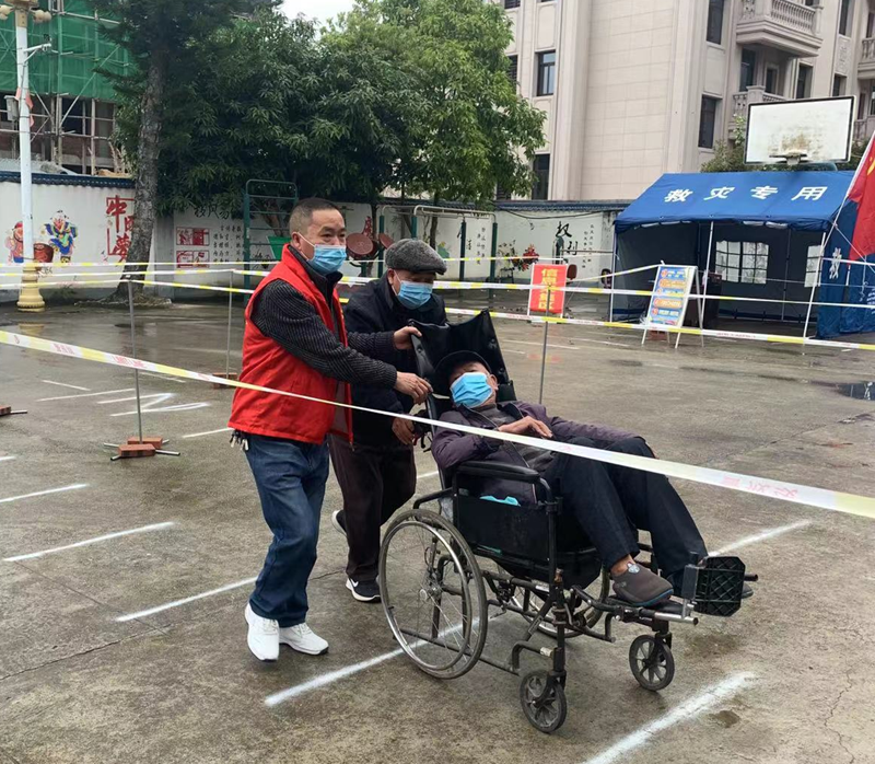 “陳伯,您們怎么過來了,剛下過雨地面滑,您腿腳不方便,我們還想著晚點上門給您做核酸呢!”中途,一位老人家坐著輪椅,在家人的幫助下來到現場,陳建武看到后立即上前攙扶老人,帶他來到綠色通道,快速完成核酸采樣。