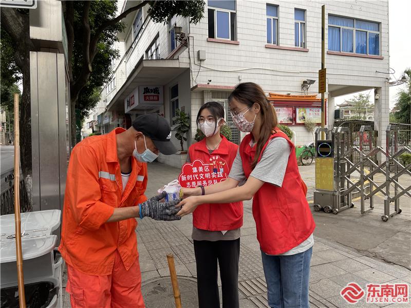 青年志愿者為環(huán)衛(wèi)工人送上暖心早餐(集美·誠毅志愿者聯(lián)盟供圖)