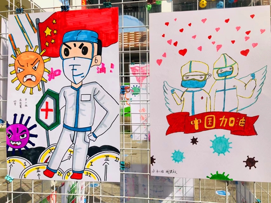 一張張生動形象的繪畫作品,清晰的地展現出孩子們對疫情的認識,也展現了孩子面對病毒來襲的勇敢和堅強,以及對白衣天使以及一線工作人員的敬仰之情……