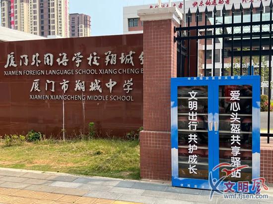 學校門口的站點保管箱整齊擺放著“愛心共享頭盔”(翔安區委文明辦供圖)