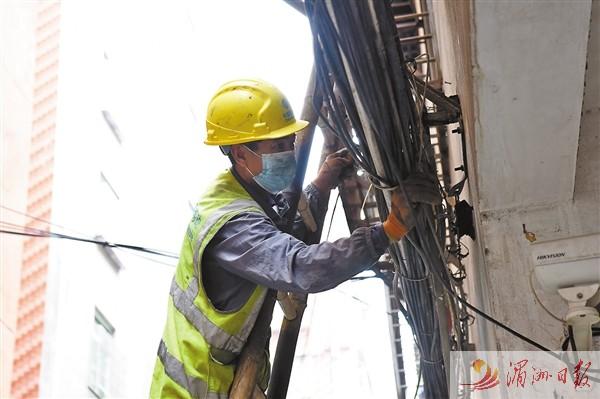 鳳凰山街道南園社區(qū),工人們正在進行空中纜線整治。湄洲日報 林曉玲 翁麗霞 梁亦嫻 供圖