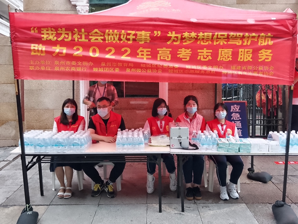 “您好,這附近是高考考場,考生們現在正在考試,麻煩您不要鳴笛,謝謝。”為了保證考生們有一個安靜、和諧的考試環境,志愿者們在考場周圍維持秩序,提醒過往的車輛、群眾保持安靜。在泉州市培元中學考點外,志愿者們在“愛心高考志愿服務驛站”里整理為考生們準備“助考文具包”“防疫應急包”和“助考盲盒”等;在泉州市第一中學考點外,周邊的愛心企業門店變身“高考服務站”,無償向考生和家長提供應急充電、免費打印、提供雨具等服務;在泉州市第九中學考點外,志愿者們為考生及送考家長提供免費飲水、防暑降溫、乘涼小憩、心理調適、秩序維護等助考服務。
