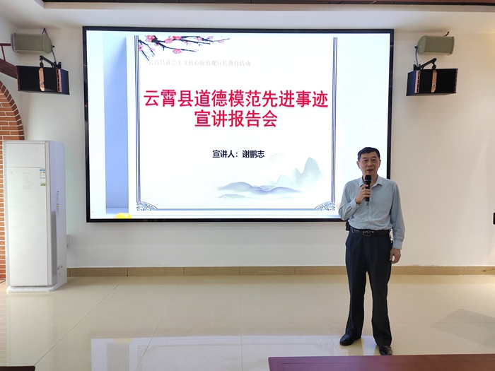 文明風6月13日訊 近日,云霄縣委文明辦在縣新時代文明實踐中心舉行五星級志愿者頒發(fā)儀式暨道德模范先進事跡宣講報告會。活動現(xiàn)場,縣委文明辦主任何煌輝為志愿者謝鵬志頒發(fā)五星級志愿者認定證書。謝鵬志為宣教口的干部職工作題為《為群眾辦實事-化千家愁腸事 解萬戶心頭憂》的講座。