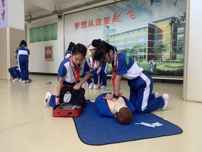 通過“體驗(yàn)式生命教育+實(shí)戰(zhàn)模擬+情景演練”模式,讓學(xué)生在學(xué)習(xí)、游戲、互動(dòng)、體驗(yàn)中提高急救知識(shí)技能,并通過模擬交通、火災(zāi)、地震現(xiàn)場(chǎng)進(jìn)行救護(hù)演練,展示所學(xué)習(xí)的應(yīng)急救護(hù)技能,扎實(shí)推進(jìn)“‘救’在身邊 校園守護(hù)”行動(dòng),促進(jìn)青少年學(xué)生健康成長(zhǎng)。