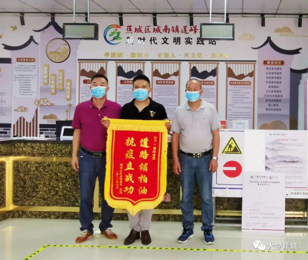 同樣的感人畫面在6月15日再度出現——蓮峰社區的黃先生作為居民代表,將一面寫有“道路鋪柏油,抗疫立戰功”的錦旗鄭重地送到了居委會辦公樓內。