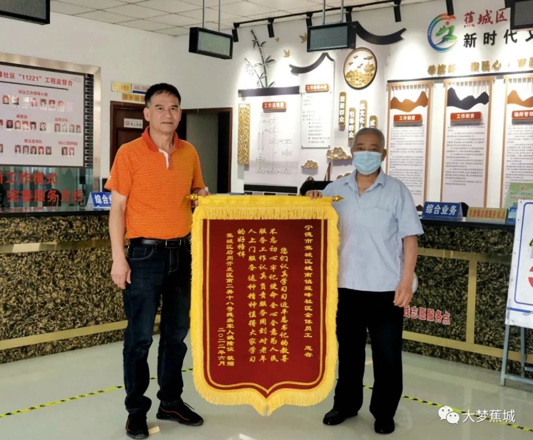 姚爺爺將錦旗送到居委會辦公樓內。蕉城區委文明辦 供圖
