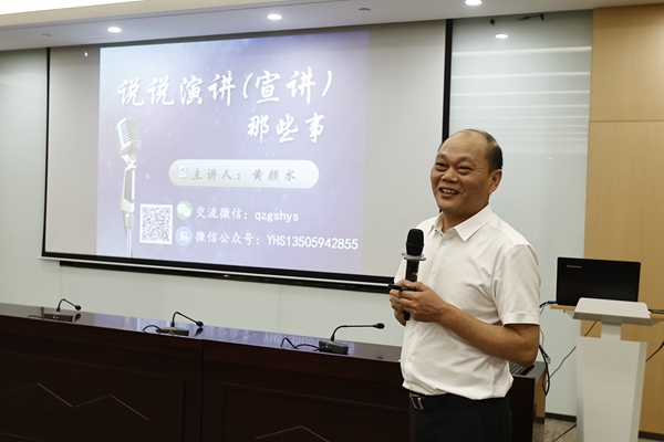 講座邀請泉州市演講與口才學會副會長兼秘書長、泉州演講達人黃顏水到場授課。黃顏水老師以《說說演講那些事》,從什么是演講、別出新意的方法、演講高潮的設計、演講技巧的運用等四個方面向學員們進行賽前指導,生動形象地解析了演講的概念、演講稿的寫作和演講的技巧。