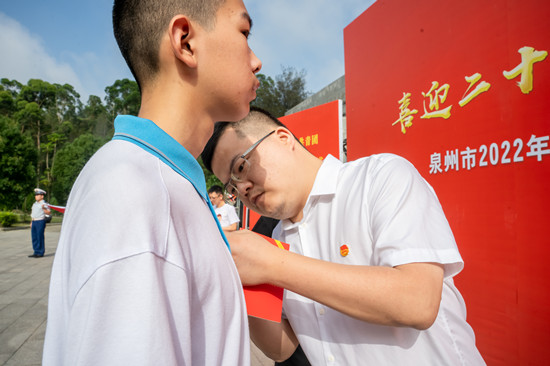 與會的領(lǐng)導為新團員代表佩戴團徽。洪燕翎 供圖