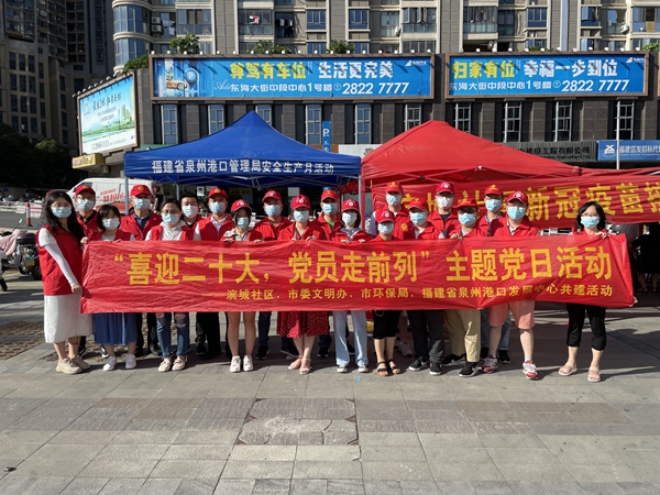 文明風6月29日訊  為迎接黨的二十大勝利召開,推進在職黨員到社區報到為群眾服務工作,6月27日上午,泉州市委文明辦與濱城社區、泉州市生態環境局、福建省泉州港口發展中心等單位共同開展“喜迎二十大,黨員走前列”主題黨日活動。