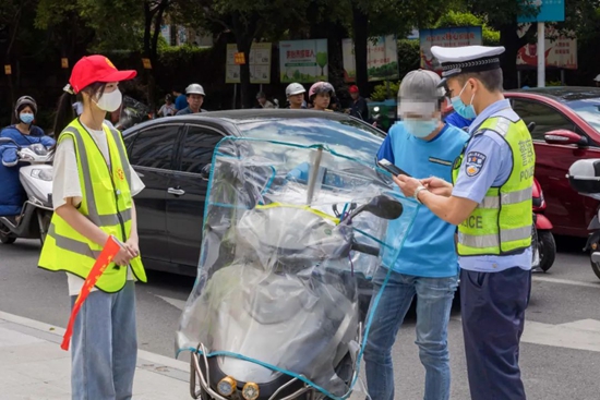 培訓(xùn)會后,授課民警帶領(lǐng)志愿者,通過觀摩他人執(zhí)勤、自己實際操作和經(jīng)驗總結(jié)討論三個步驟,對行人和機動車無視交通信號燈、橫穿馬路、不走行人橫道、逆向行駛、違法停車、未戴安全頭盔等交通違法行為進(jìn)行了現(xiàn)場教學(xué)。