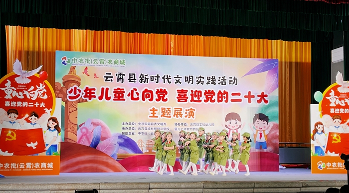 文明風7月5日訊 為引導云霄縣廣大未成年人扣好人生第一粒扣子,從小聽黨話、感黨恩、跟黨走,厚植愛黨愛國愛社會主義的情懷。近日,由云霄縣委文明辦主辦,云霄縣實驗幼兒園、中農批(云霄)農商城協辦,成長樹培訓學校、昱兒藝術教育舞蹈部承辦的新時代文明實踐活動“少年兒童心向黨 喜迎黨的二十大”主題展演在我縣人民大會堂舉行。