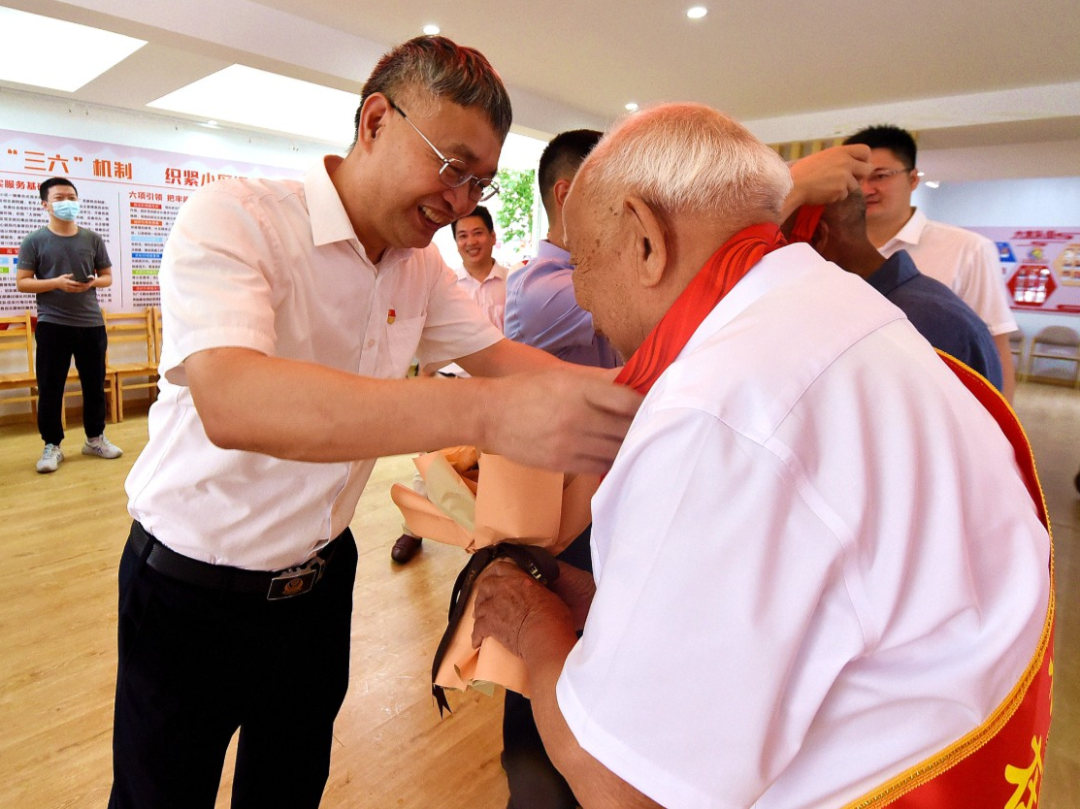 在金溪社區,何必良與有著50年以上黨齡的梁樹炎、鐘清宋兩位老同志親切交談,關切詢問他們的生活和身體情況,共同回顧黨的光輝歷程,并為他們頒發佩戴“光榮在黨50年”紀念章。