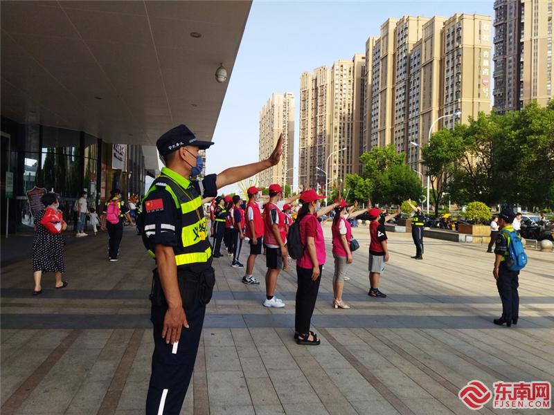 志愿者在義務(wù)交警的帶領(lǐng)下學(xué)習(xí)交通手勢(shì)(寧海社區(qū)新時(shí)代文明實(shí)踐站供圖)