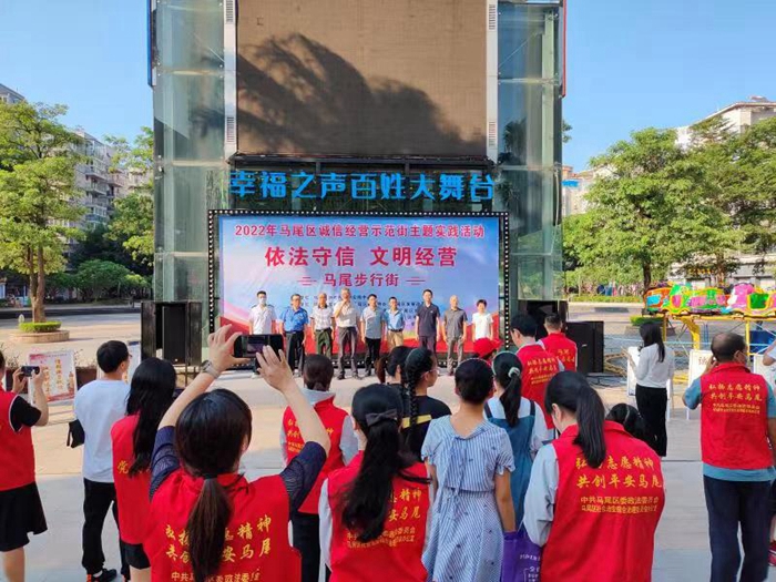 文明風(fēng)8月1日訊 為弘揚(yáng)和踐行社會主義核心價(jià)值觀,營造文明誠信社會環(huán)境,7月29日,馬尾區(qū)在羅建路步行街舉行了2022年誠信示范街主題實(shí)踐活動。主承辦單位代表、誠信企業(yè)代表、誠信商家代表和社區(qū)群眾等共100余人參加活動。
