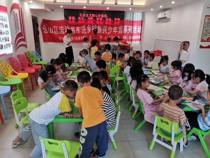 文明風8月2日訊 為向廣大青少年傳播“多讀書、讀好書、好讀書”的理念,不斷提升孩子們的思想道德素養和文化素養,引導廣大少兒養成良好的閱讀習慣。2022年7月,由倉山區委文明辦、倉山區教育局、倉山區文體旅局主辦,倉山區圖書館承辦的“倉山區流動書車進鄉村‘復興少年宮’系列活動”先后走進了蓋山鎮、城門鎮、倉山鎮鄉村“復興少年宮”,為孩子們送去了一頓豐盛的“文化大餐”。