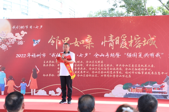 文明風8月3日訊 為豐富市民節日文化生活,迎接黨的二十大勝利召開,8月2日上午,由中共福州市委文明辦、倉山區文明委主辦;中共倉山區委宣傳部、中共倉山區委文明辦、中共倉山區委區直機關工委、中共倉山區委臺港澳辦、倉山區文化體育和旅游局、倉山區融媒體中心、倉山區旅游事業發展中心、倉山區金山街道辦事處、福州市公路事業發展應急中心共同承辦;倉山區文化館、倉山區金環社區、北京同仁堂倉山萬達店協辦的“鄰里如親情暖榕城”——2022年福州市“我們的節日·七夕”倉山專場暨“強國復興有我”主題活動在倉山區榕城廣場舉辦。中共福州市委文明辦四級調研員黃紅,中共倉山區委常委、宣傳部部長李亦仁等領導出席活動。本次活動還邀請了在榕臺胞陳錦丘并為他送上七夕禮包。