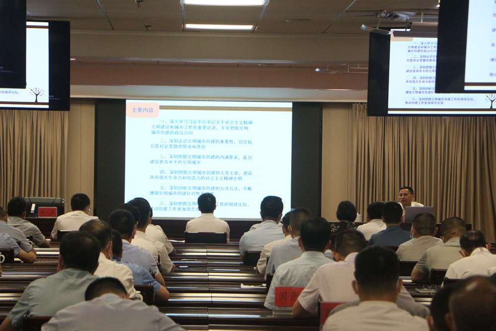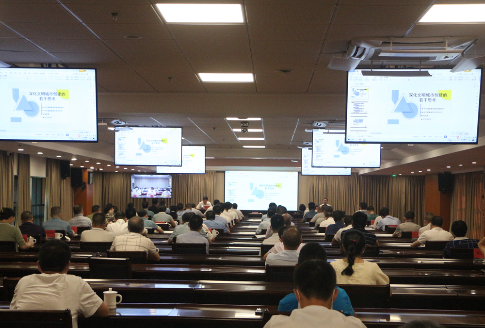 講座中,陳添貴以《深化全國文明城市創建的若干思考》為題,圍繞深入學習習近平總書記關于社會主義精神文明建設和城市工作的重要論述、深刻認識文明城市創建的重要性、深刻把握文明城市創建的內涵要求、深刻把握文明城市創建的主責主業、深刻把握文明城市創建的方式方法、深刻把握文明城市創建工作的規律定位等六個方面,以政策理論高度,并緊密聯系實際,對創建全國文明城市工作特別是考評指標體系作了系統宣講和深入解讀。