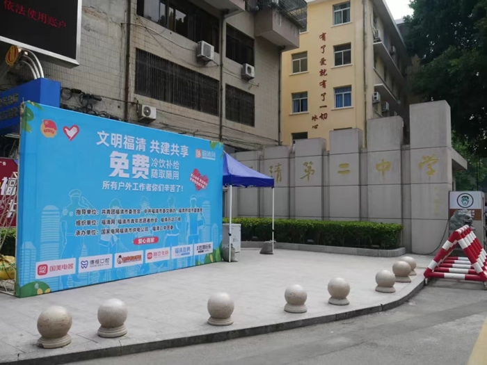 冰箱后方,“愛心冰柜,清涼驛站,致敬福清城市超人”幾個字格外醒目。據悉,“愛心冰柜”活動由福清團市委聯(lián)合福清市委文明辦、福清市城管局發(fā)起,活動持續(xù)一個月,在福清城區(qū)設置4處點位,免費為戶外工作者提供冷飲。