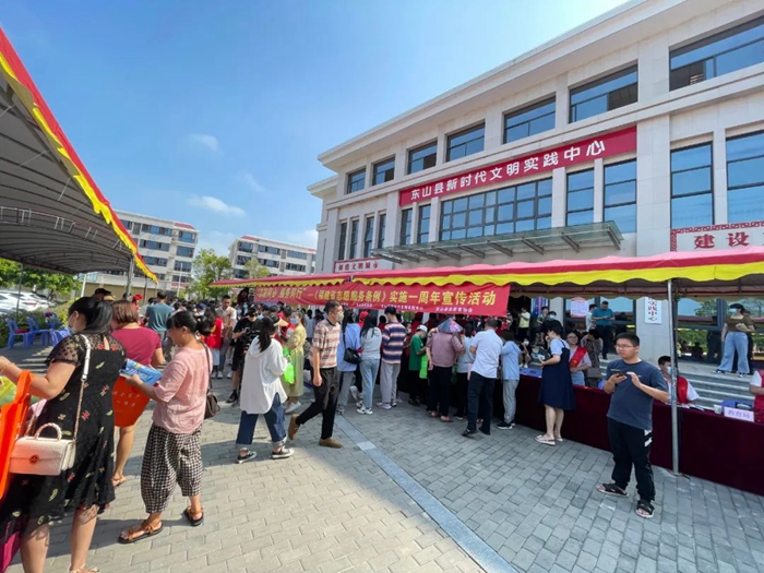 文明風8月5日訊 為深入貫徹習近平新時代中國特色社會主義思想,宣傳貫徹《福建省志愿服務條例》實施一周年,進一步營造人人關心、支持、參與志愿服務活動的濃厚社會氛圍,創建全國文明城市,迎接黨的二十大勝利召開。7月27日上午,東山縣新時代文明實踐中心、東山縣委文明辦組織開展了以“志愿同心、服務同行”為主題的《福建省志愿服務條例》實施一周年宣傳文明志愿實踐服務活動。