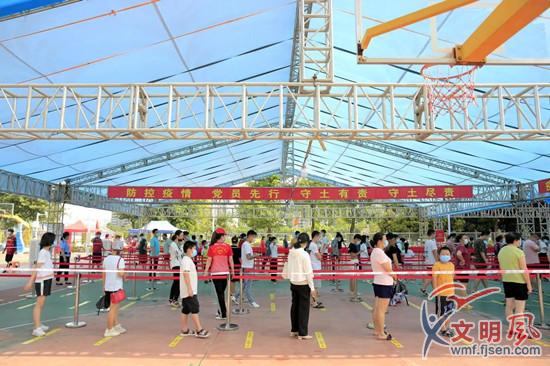 在志愿者的有序引導下,各個采樣點隊伍間隔有距、流動順暢。(翔安區委文明辦供圖)