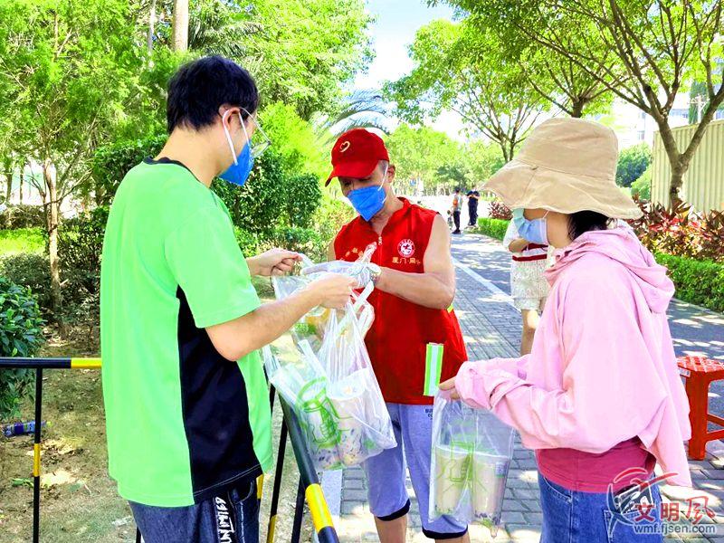 濱海社區黨員胡敏金特意為志愿者們送來清涼奶茶解暑。(濱海社區供圖)