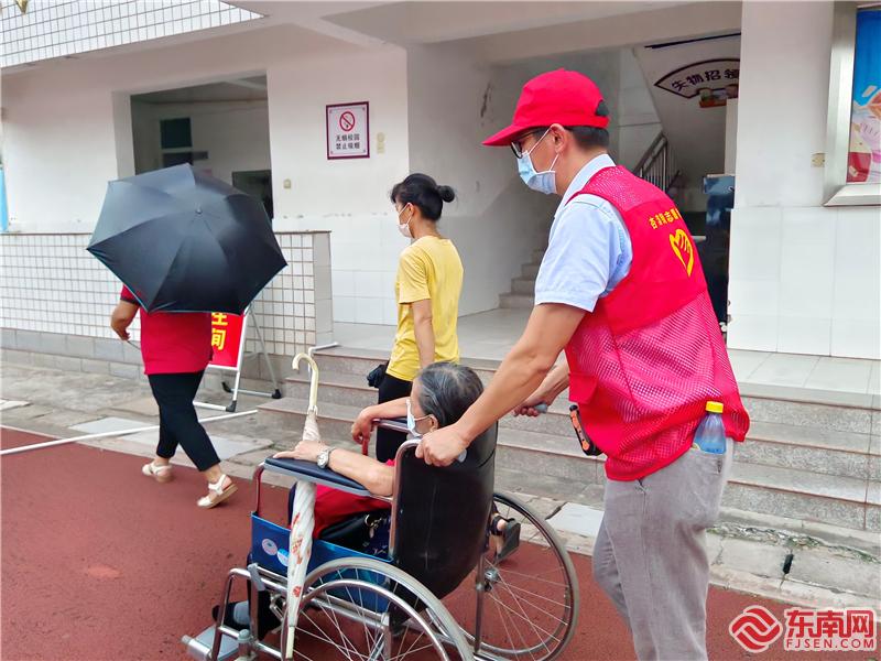 “城管藍”攙扶老人進場采樣。(集美·誠毅志愿者聯盟供圖)