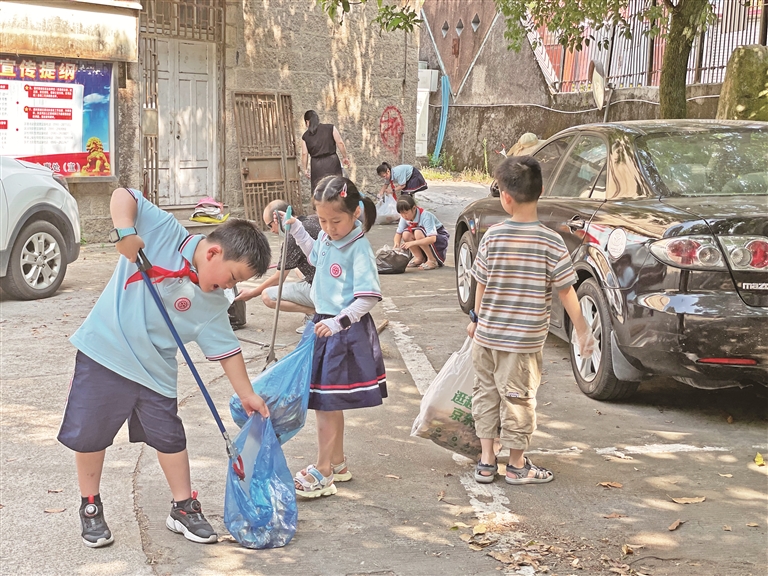 寧師附小的小志愿者走進社區,化身環保小衛士。張穎珍 攝