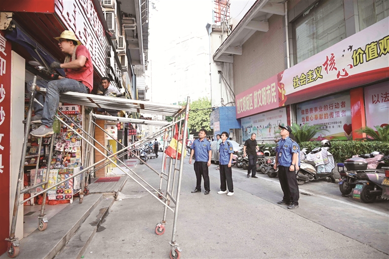 在時代廣場,工人們在雨披下方快速搭好梯架,根據不同部位,采取相應工具對金屬架和篷頂展開拆除工作。同時,執法人員還為沿途商戶普及相關法律知識,勸導他們要自覺遵守相關規定,不得占道經營,保持店前整潔有序。