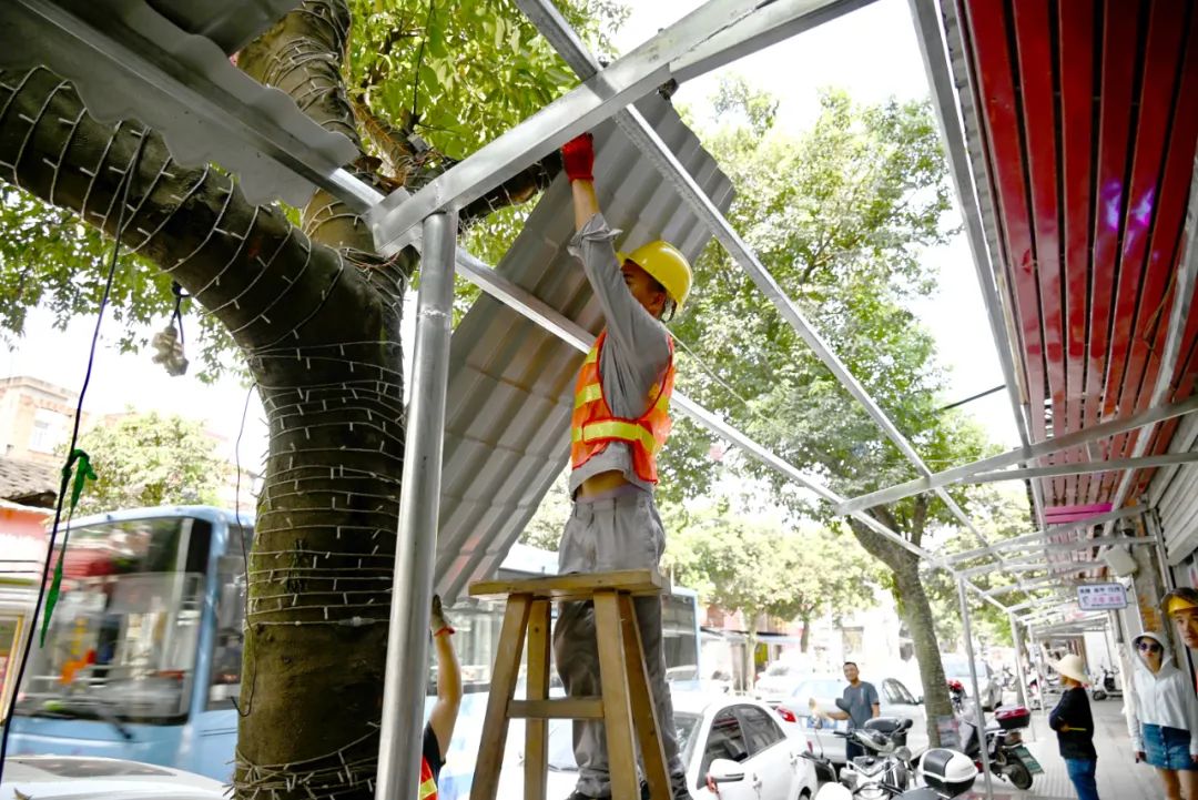 “原先一些商戶的雨披因為年久老化,不僅不美觀,有些還會漏水,所以借著這次雨披改造項目,我們統一進行更換,讓街道看起來更加美觀和整齊?!爆F場負責人鐘慶華說。