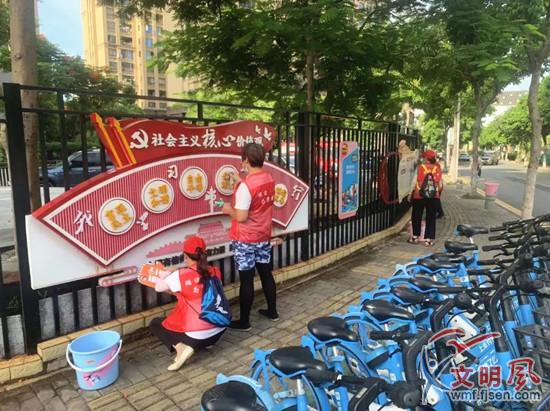 志愿者清洗宣傳欄(金山街道供圖)