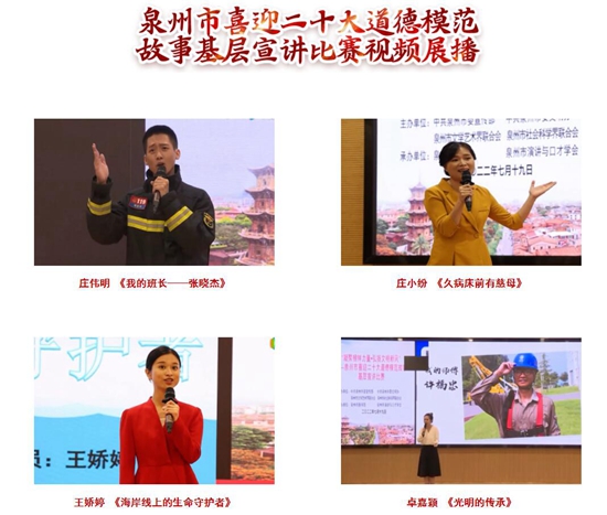 凝聚榜樣力量,弘揚文明新風。活動期間,泉州市喜迎黨的二十大道德模范故事基層宣講比賽在泉州市圖書館舉行。活動通過組織宣講員選拔評選的形式,由宣講員講述泉州道德模范故事、身邊好人事跡、文明城市創建、新時代文明實踐、群眾性精神文明創建等故事、事跡、做法、案例。如,泉州市消防救援支隊特勤大隊宣講員莊偉明聚焦主責主業,講述了《我的班長》張曉杰的故事,為大家呈現消防救援人員扎根基層,用自己的青春譜寫奉獻之歌的感人事。
