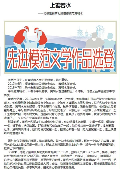 為了迎接黨的二十大勝利召開,進一步營造學習、宣傳、崇尚道德模范的濃厚氛圍,樹立好人好報的價值導向,近期,泉州市委宣傳部、泉州市委文明辦、泉州市文聯等部門聯合開展喜迎黨的二十大道德模范學習宣傳活動。