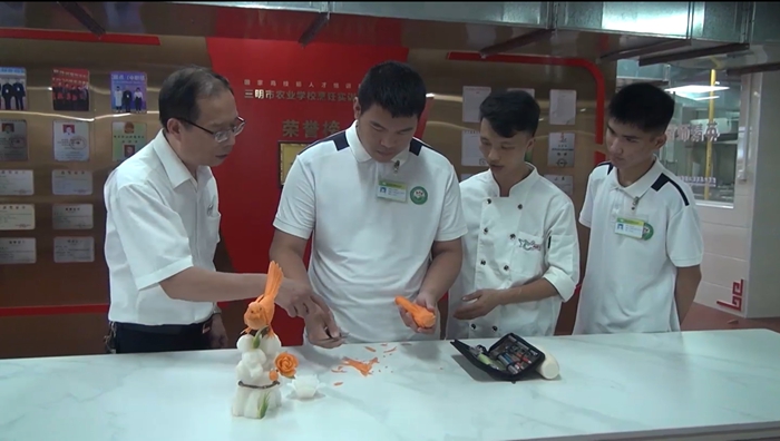 鄭壽兒老師在烹飪課上指導(dǎo)學(xué)生雕刻