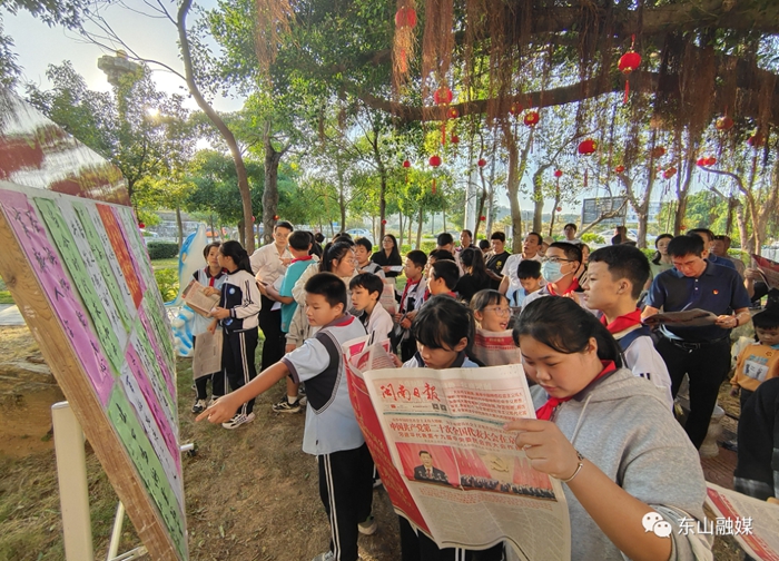 在宣講活動燈謎競猜區(qū),以黨的二十大報告中的關(guān)鍵詞和熱點話題為主要內(nèi)容的20多條燈謎,吸引了不少村民和學(xué)生們駐足競猜。大家或互相探討,或翻閱黨的二十大報告相關(guān)知識點,現(xiàn)場成了學(xué)習(xí)黨的二十大精神的生動課堂。