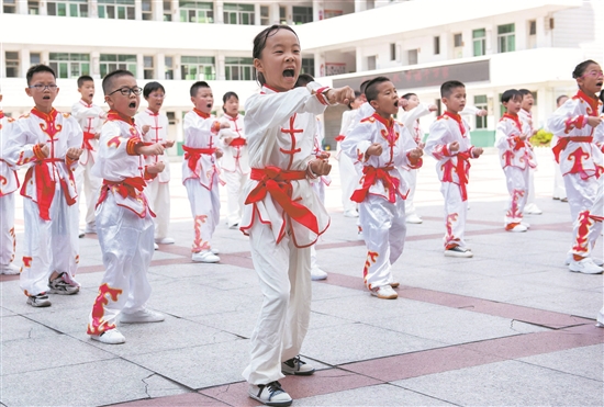 在永春縣桃城中心小學的“復興少年宮”則有著永春白鶴拳的課程。“我校聘請泉州市級非遺傳承人鄭曉嶸、永春縣級非遺傳承人陳東建等人為校外輔導員,到學校開展非遺進校園活動。”學校老師李曉毅介紹道,該校成立白鶴拳興趣小組已經有十年,旨在倡導學生們習武健身,增強自信心,培養堅忍的意志品格,塑造自強不息的精神。“這種方式對白鶴拳的推廣與普及起到了很大的作用。”鄭曉嶸說道。