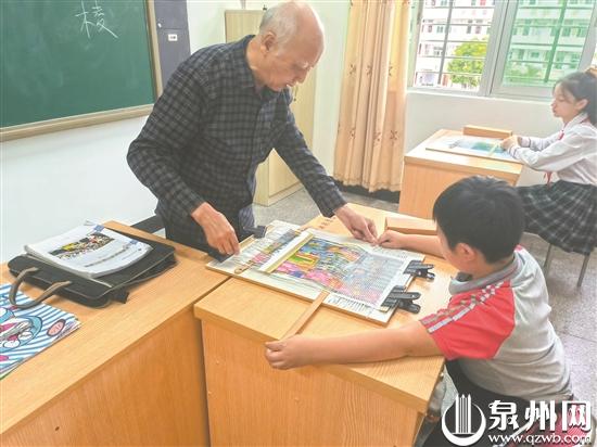 “我們學校作為閩南文化傳承基地校,學校‘復興少年宮’開設紙織畫特色課程,聘請傳承人林志恩進校傳授技藝。”輔助林志恩上課的美術老師林燕麗介紹稱,林志恩今年已經80歲,仍堅持每周三下午到學校指導學生制作紙織畫。他從2010年下半年將紙織畫帶入校園,到現在已經十余年。為了適應學校教學,2012年起,他用“板式拉紙條分經法”代替傳統的“拉線分經法”,讓學生更容易接受。