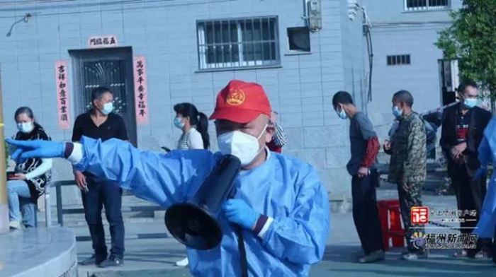 閩清縣第三屆道德模范提名獎、白中鎮人民政府經濟發展辦副主任舉著大喇叭在街頭巷尾宣傳防疫要求