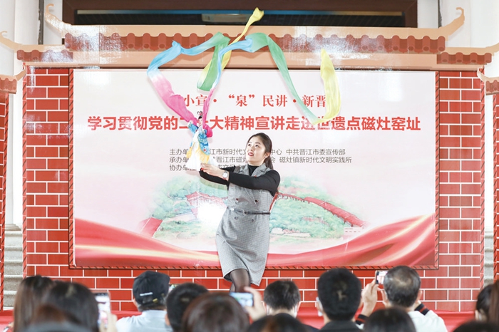 坐落在窯址公園里的泉州古外銷陶瓷博物館內(nèi),晉江市委宣傳部的干部代表,晉江市文保中心磁灶窯址工作人員,以及磁灶鎮(zhèn)宣傳文化工作人員、“非遺”傳承人等,一起聆聽福建省“非遺”傳承人蔡美娜帶來(lái)的黨的二十大精神主題宣講——《在新時(shí)代展現(xiàn)“非遺”藝術(shù)人的新?lián)?dāng)》。大家認(rèn)真聆聽,不時(shí)報(bào)以熱烈掌聲,現(xiàn)場(chǎng)氣氛十分熱烈。