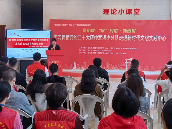文明風(fēng)11月11日訊 學(xué)習(xí)宣傳貫徹黨的二十大精神,是當(dāng)前和今后一個時期的首要政治任務(wù)。為進(jìn)一步掀起學(xué)習(xí)黨的二十大精神熱潮,推動習(xí)近平新時代中國特色社會主義思想往深里走、往實(shí)里走、往心里走,連日來,晉江市充分發(fā)揮新時代文明實(shí)踐陣地資源作用,組織開展“福小宣?‘泉’民講?新晉講”黨的二十大精神宣講小分隊(duì)走進(jìn)新時代文明實(shí)踐中心(所站)系列活動,深入開展宣傳,迅速掀起學(xué)習(xí)宣傳貫徹黨的二十大精神熱潮。