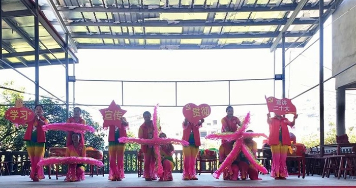 另一側小廣場上,各支演出隊精心編排的經典文藝節目拉開序幕。巾幗志愿者陳惠萍等人用扇子舞演繹“學習、宣傳、貫徹、二十大”的字樣,動作和諧優美,整齊劃一;志愿者陳建明創新宣講形式,將黨的二十大精神轉化為生動形象、寓教于樂的快板作品,通俗易懂、朗朗上口的快板把黨的二十大精神融入到日常宣傳中,充分把黨的二十大精神“唱出來”“演出來”“展出來”,成為本次活動的一大亮點。村里書法愛好者現場揮毫潑墨,寫下學習貫徹黨的二十大精神的相關宣傳標語。隨后,趣味性的知識互動“輪番上陣”,贏得現場人員的陣陣掌聲,在寓教于樂中讓黨的二十大精神聲聲入耳、入腦入心,受到大家廣泛好評。“像這樣的活動要經常舉行,要學習好、宣傳好、貫徹好黨的二十大精神。”該村老協會會長、老黨員李春興如說。