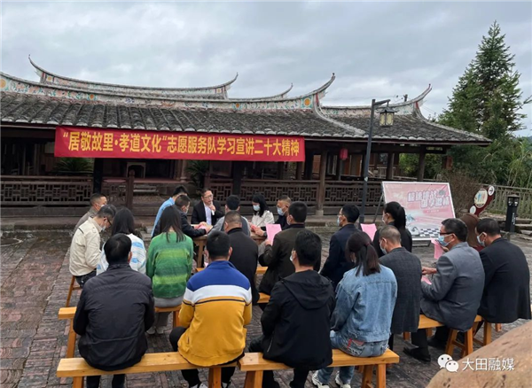 大田縣“居敬故里·孝道文化”志愿服務隊到廣平鎮五龍山廣場,結合郭居敬孝道文化及鎮情實際,用通俗易懂的語言對黨的二十大精神進行詳細解讀。