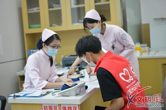 活動當(dāng)天早上8點(diǎn),志愿者就來到了廈大翔安醫(yī)院獻(xiàn)血屋,其中有獻(xiàn)血多次的老面孔,也有初次獻(xiàn)血的新成員。大家在醫(yī)護(hù)人員的指引下,依次進(jìn)行體溫檢測、填寫登記表、采樣驗(yàn)血。經(jīng)檢測合格后,他們又一個個擼起衣袖,獻(xiàn)出了鮮紅的熱血。