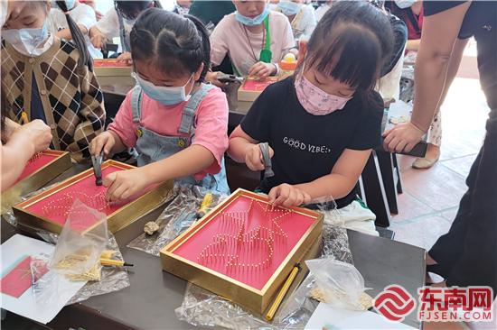“五角星是我們國旗上的一顆星,火炬代表少先隊的熱情與希望,象征著少先隊員要做共產主義事業接班人的崇高理想。”當天下午,黃莊社區新時代文明實踐站社工組織在場青少年使用釘子繞線畫,制作富有立體感和藝術感的中國少年先鋒隊隊徽,引導廣大青少年知史愛黨、知史愛國,在實踐中堅定社會主義接班人的信念。