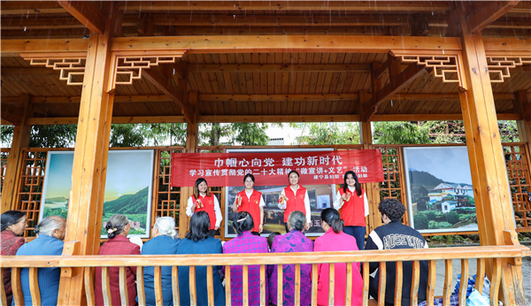 建寧縣濉溪鎮(zhèn)高峰村新時代文明實踐站里婦聯(lián)干部正在用快板曲藝宣講黨的二十大精神